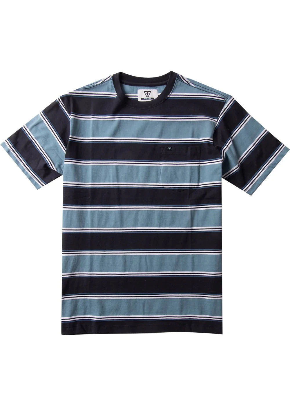 Standout broad-stripe pocket tee, an absolute essential. Become acquainted with the Cannon Eco, a premium 30 singles yarn dyed crew neck. Features side seam woven label and Vissla woven label with garment soft wash.