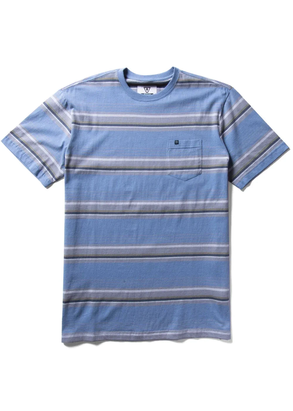 The Olada Eco Tee is a premium 24 singles stripe yarn dyed crew neck with front pocket, styled with an descending array of colored and gray stripes. Made with 100% Organic Cotton, this eco-friendly tee features a side seam woven label and Vissla woven label with garment soft wash.
