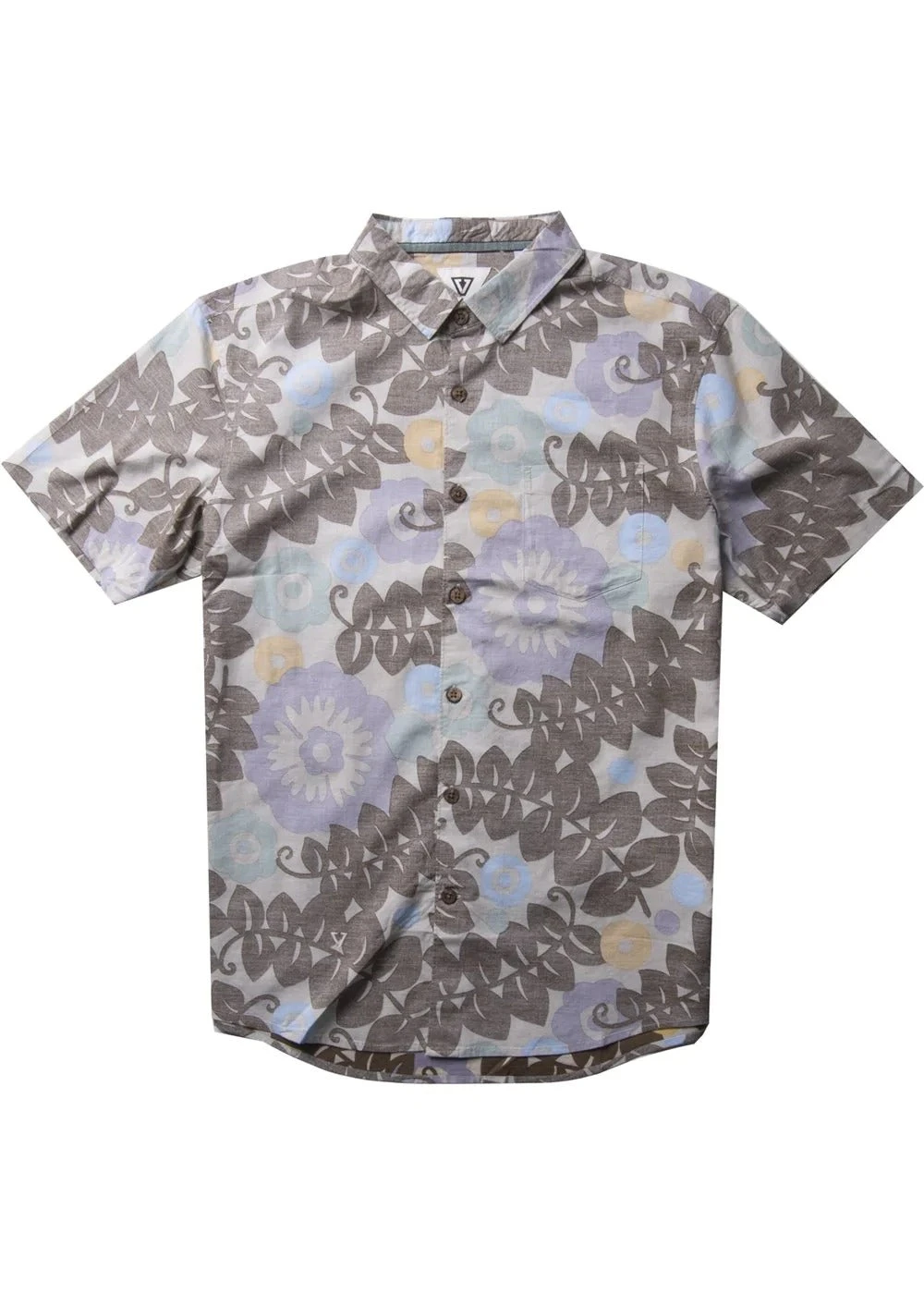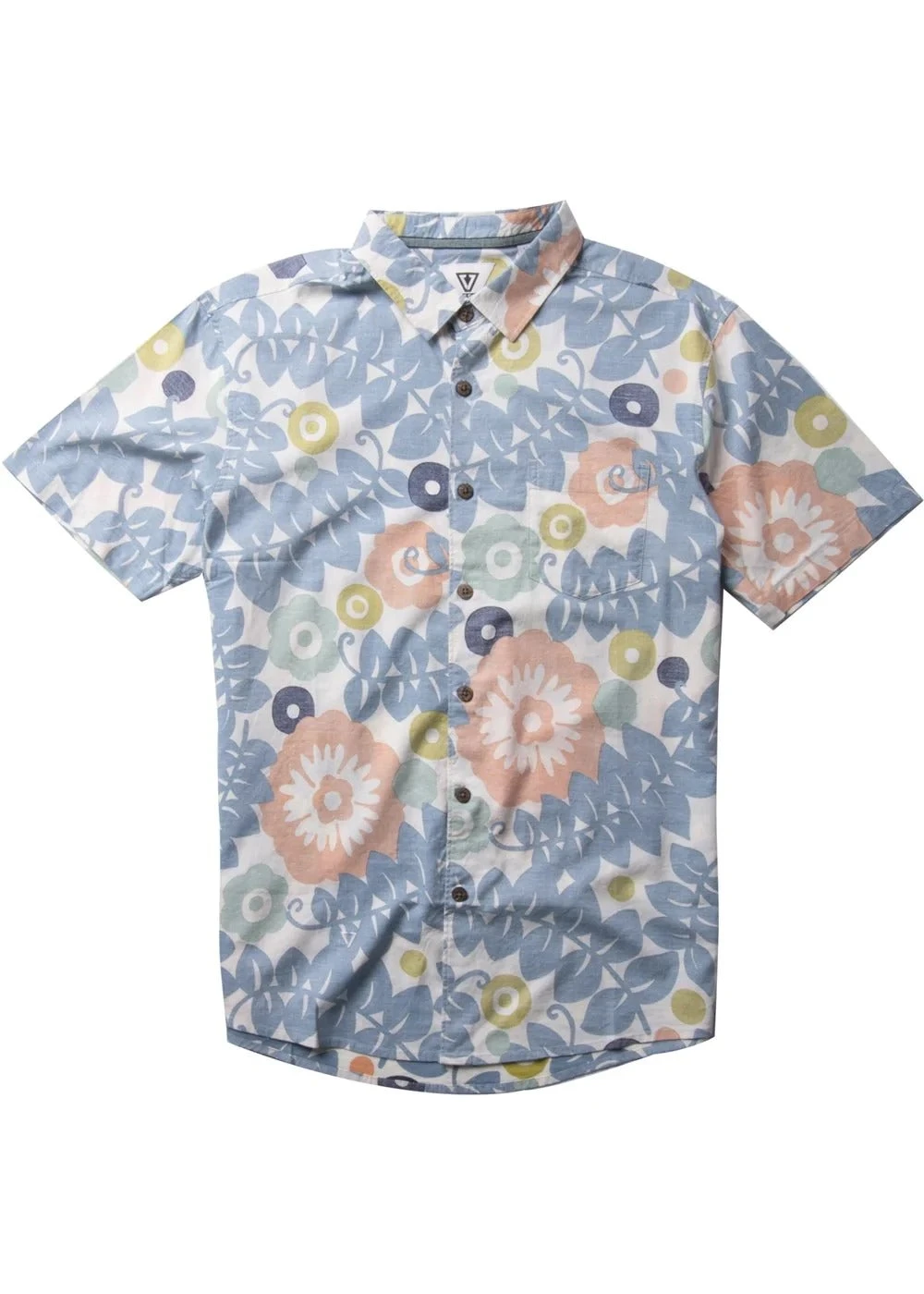 The Zanzabar Shirt, a reverse printed, sub-tropic woven made from a lightweight blend of cotton and viscose. Styling includes a fold over center front placket and front chest pocket. Garment washed with enzyme + softener.